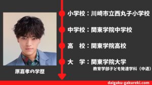 詳しくは、こちらの【原嘉孝の学歴】関東学院大学「教育学部子ども発達学科」(中退)・関東学院高校を卒業?偏差値や卒業アルバム情報まとめをどうぞご覧ください。