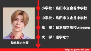 詳しくは、こちらの【松島聡の学歴】日本航空高校を卒業?大学はどこ?偏差値や卒業アルバム情報まとめをどうぞご覧ください。