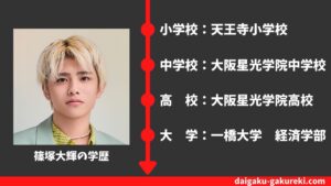 詳しくは、こちらの【篠塚大輝の学歴】一橋大学・大阪星光学院高校を卒業?偏差値や卒業アルバム情報まとめをどうぞご覧ください。
