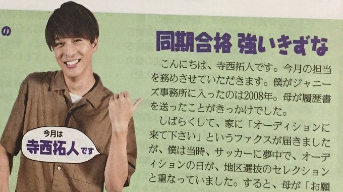 寺西さんは13歳の2008年4月20日、ジャニーズ事務所のオーディションを受け、そのまま入所することになりました。