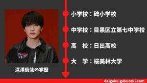 詳しくは、こちらの【深澤辰哉の学歴】桜美林大学・日出高校を卒業?偏差値や卒業アルバム情報まとめをどうぞご覧ください。