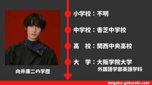 詳しくは、こちらの【向井康二の学歴】大阪学院大学・関西中央高校を卒業?偏差値や卒業アルバム情報まとめをどうぞご覧ください。