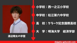 詳しくは、こちらの【渡辺翔太の学歴】明海大学・クラーク記念国際高校を卒業?偏差値や卒業アルバム情報まとめをどうぞご覧ください。
